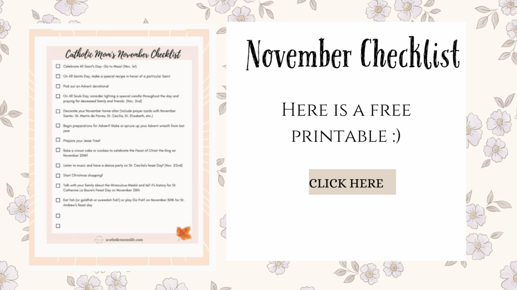 Advent is right around the corner! As you know, Christmas can be such a busy season. With all the shopping, cooking, and activities, it’s easy to feel overwhelmed. I have found that planning for Advent and Christmas before Advent begins makes the season more peaceful. Advent is meant to be a time of quiet reflection, a time when we prepare our hearts for the birth of Christ. In reality, many of us end up spending this time feeling anxious as we rush to prepare for Christmas! Organizing and planning ahead ensures that the holidays remain peaceful.I’ve created a checklist to help you keep track of all the things you need to get done before Christmas, I try to finish this whole list or most of the list by ThanksGiving! I have created a checklist (listed at the bottom of the page is the free printable plus a checklist for NOVEMBER!)